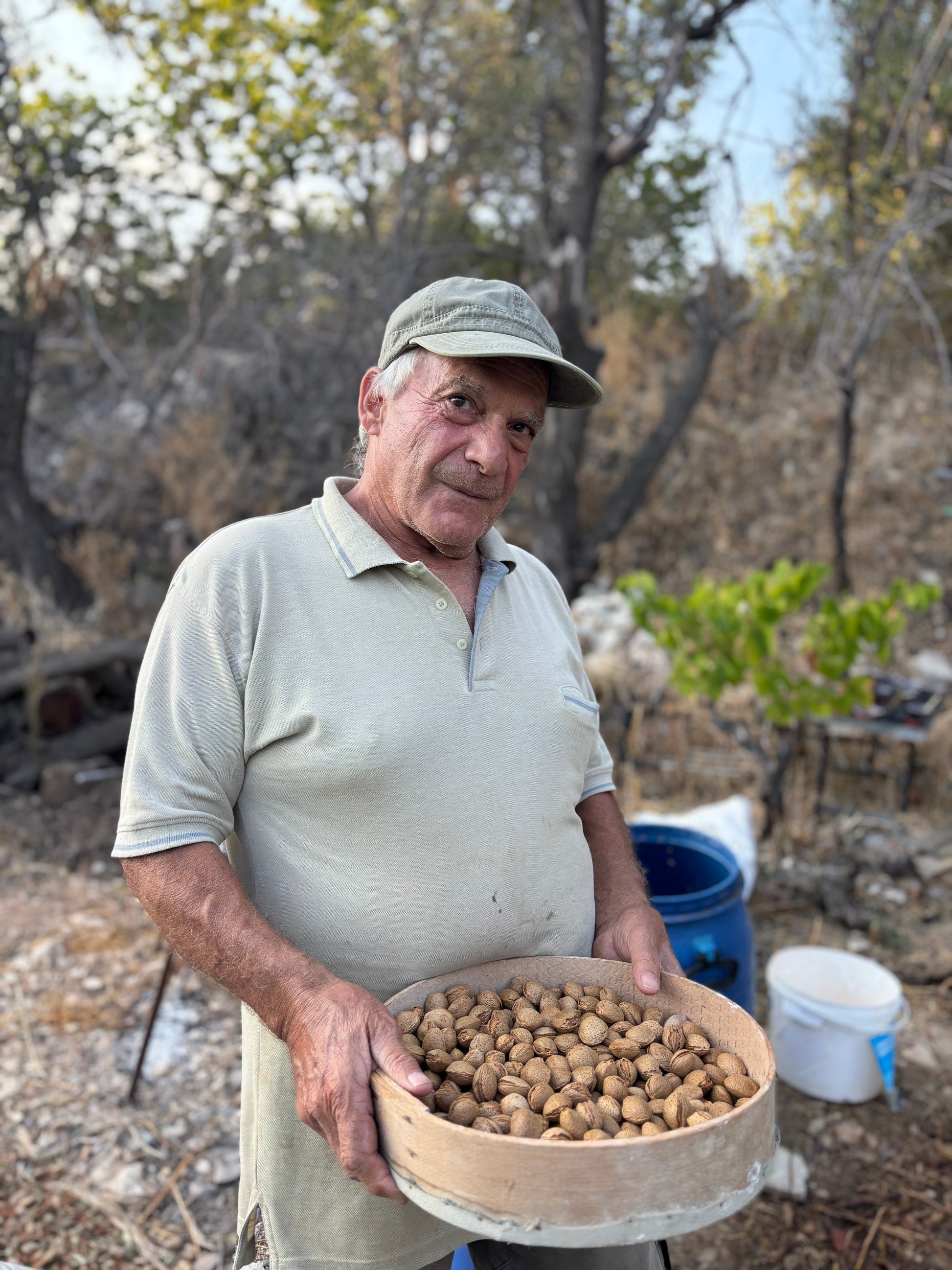 Our Sweet Almond Oil (Prunus dulcis) is sourced from our dear friend and passionate farmer Aristides in Silikou, in the Troodos mountains of Cyprus. His trees are tended following biodynamic principles, and he harvests and sorts them by hand.