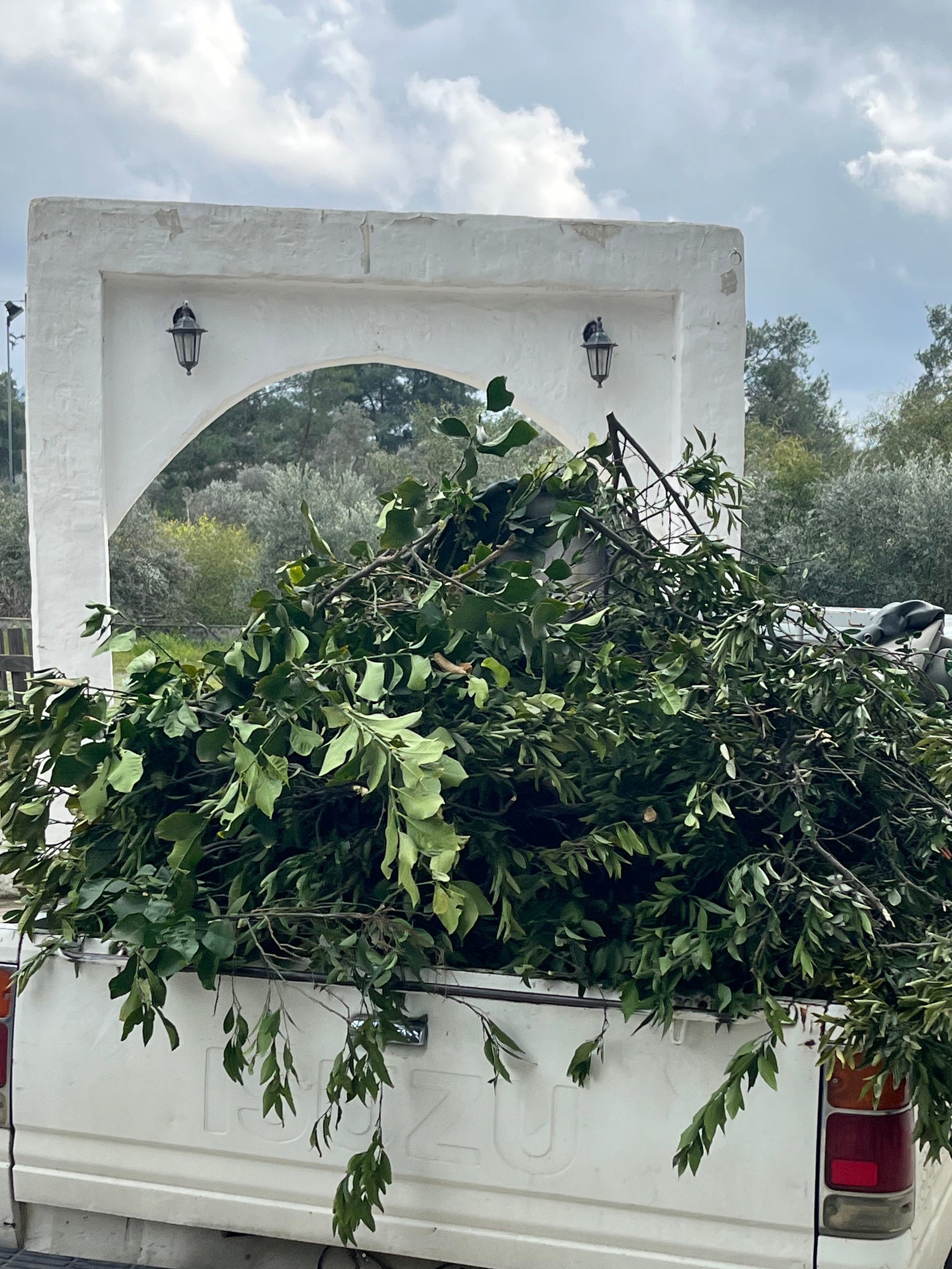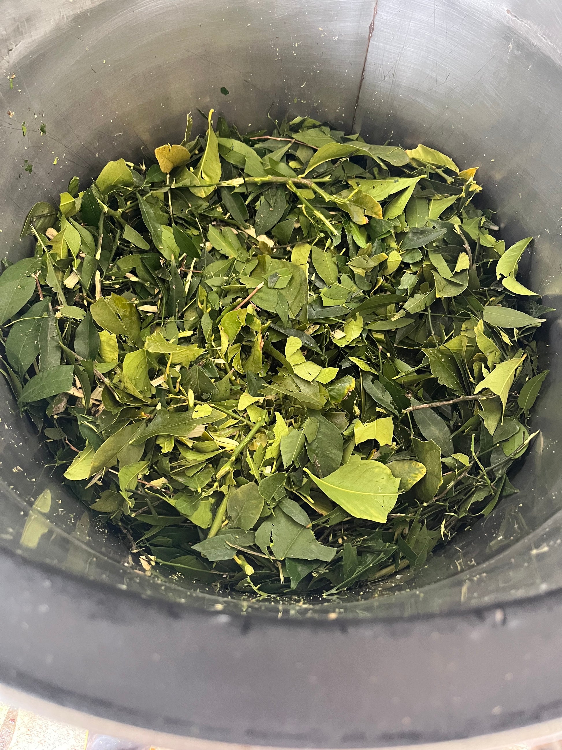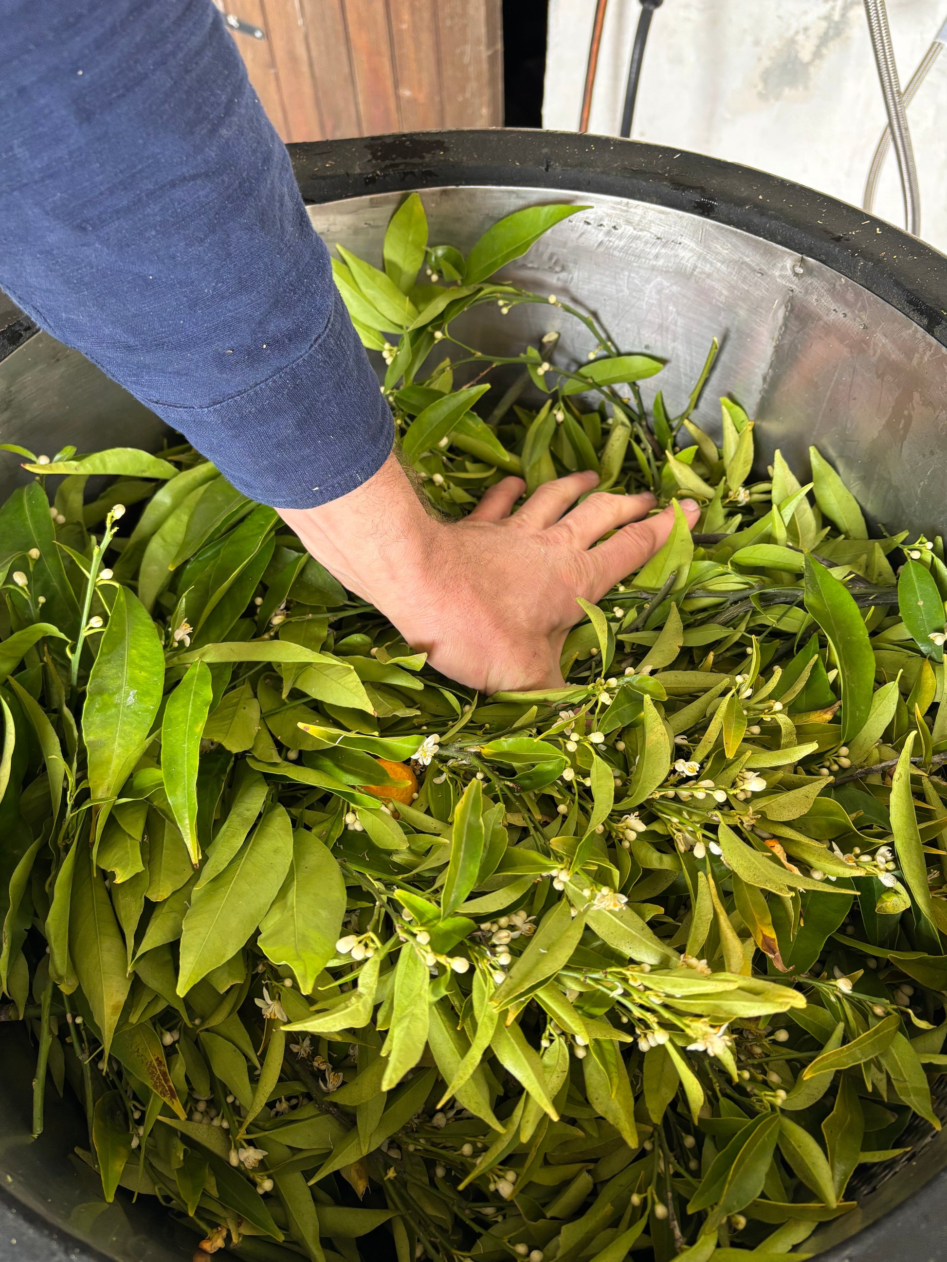 Our latest batch of Citrus Petitgrain Essential oil was distilled in March 2025 from the leaves, green twigs and blossoms of Citrus trees sourced from an organic farm, and various gardens of people in our area. We collaborate with farmers and families that traditionally prune their trees after the last fruits are harvested, and when the trees start to form new blossoms and small fruits. We collect the prunings, and sometimes we go ourselves to peoples’ houses to give their trees a haircut and remove the branches! We then prepare the material by chopping it and putting them in the still. We run the distillation for three to four hours, and the yield is very low, between 0.1-0.3%!