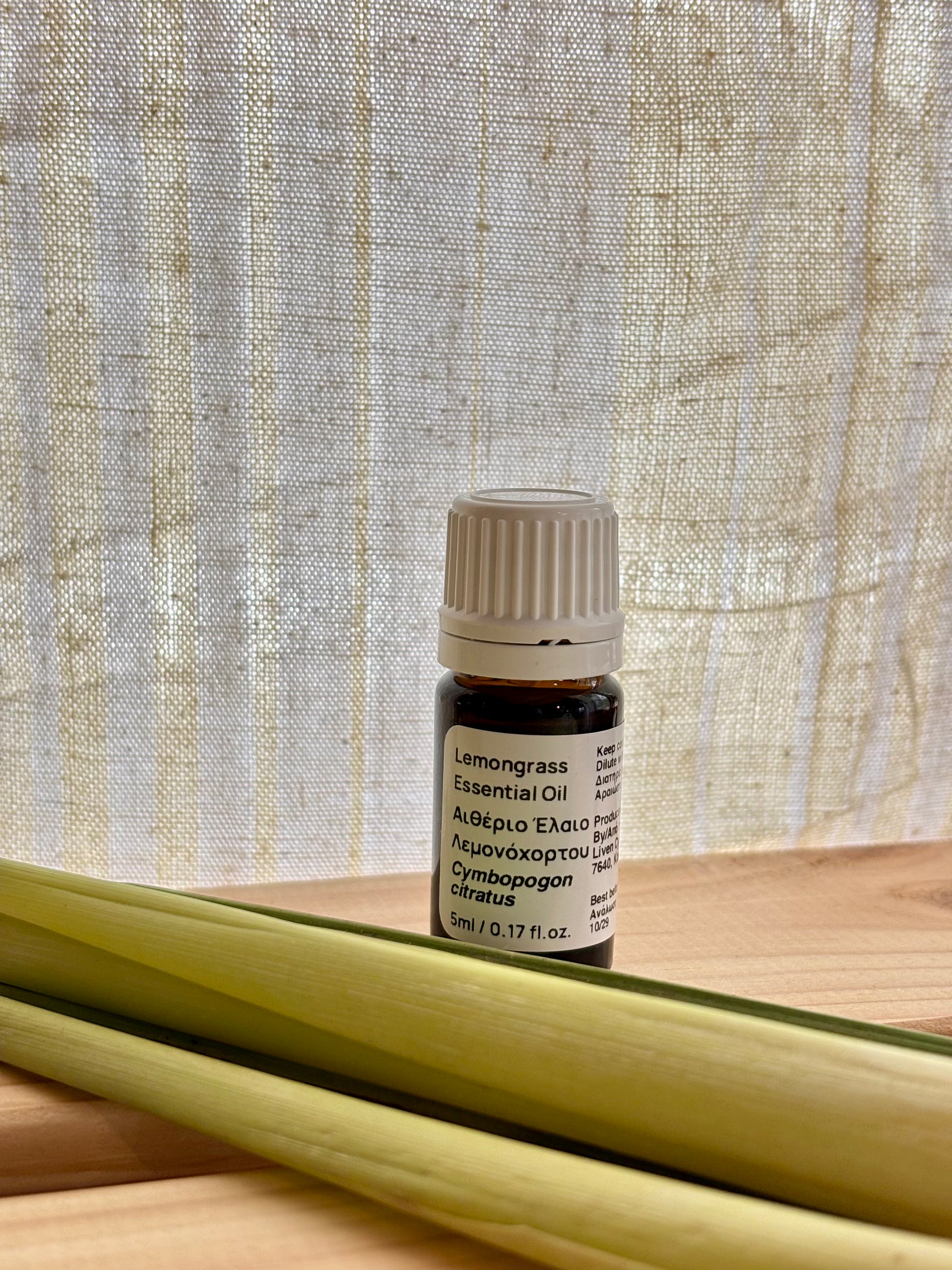 Our essential oil was steam distilled from lemongrass leaves. We sourced our lemongrass from two organic farms in Cyprus. When growing lemongrass for the market, the useful part is the stalk. When harvesting the stalks, the top stems and leaves are being left in the field. For us, the top parts are useful too, as so we asked our suppliers to collect them for our distillations.