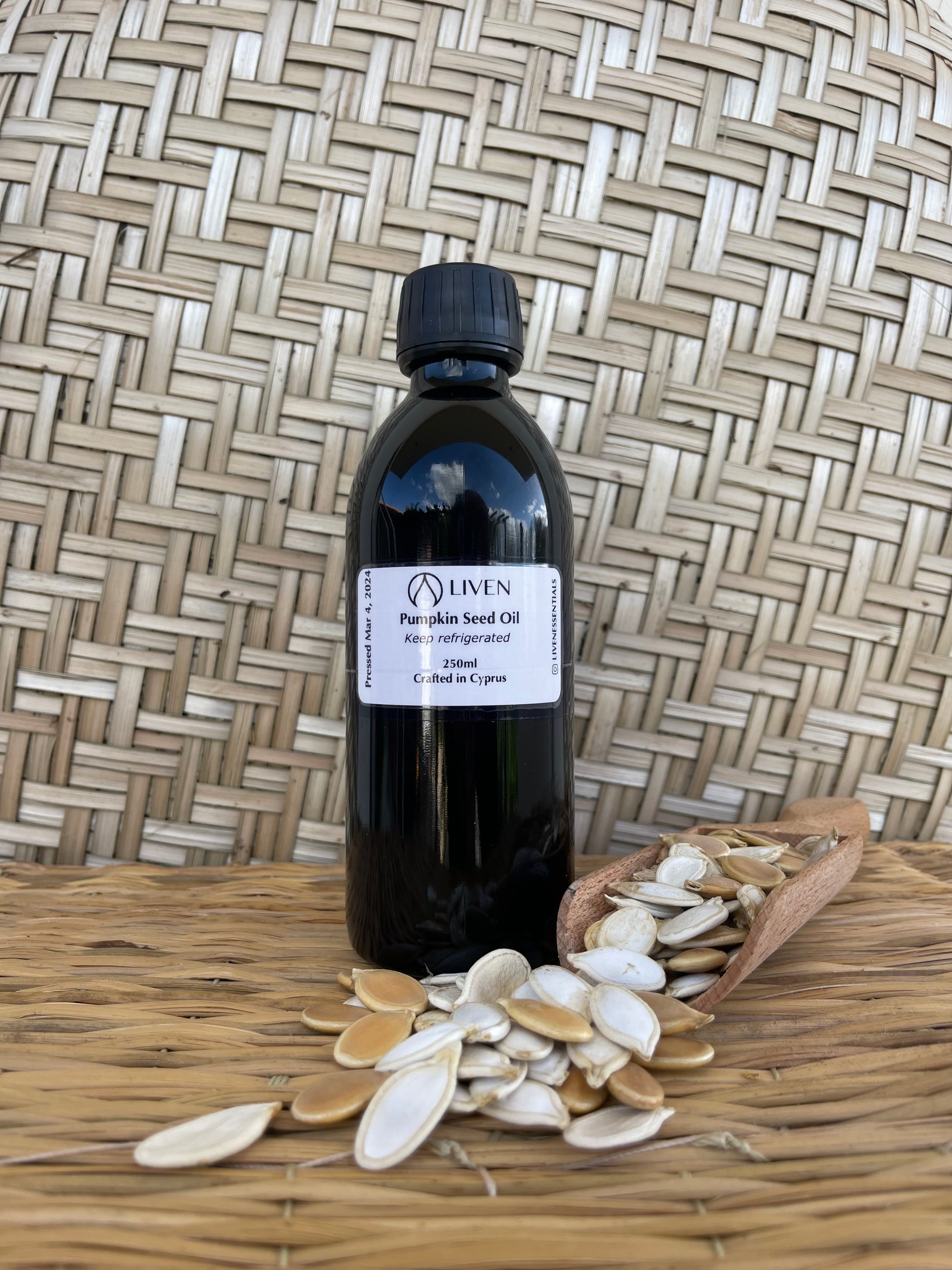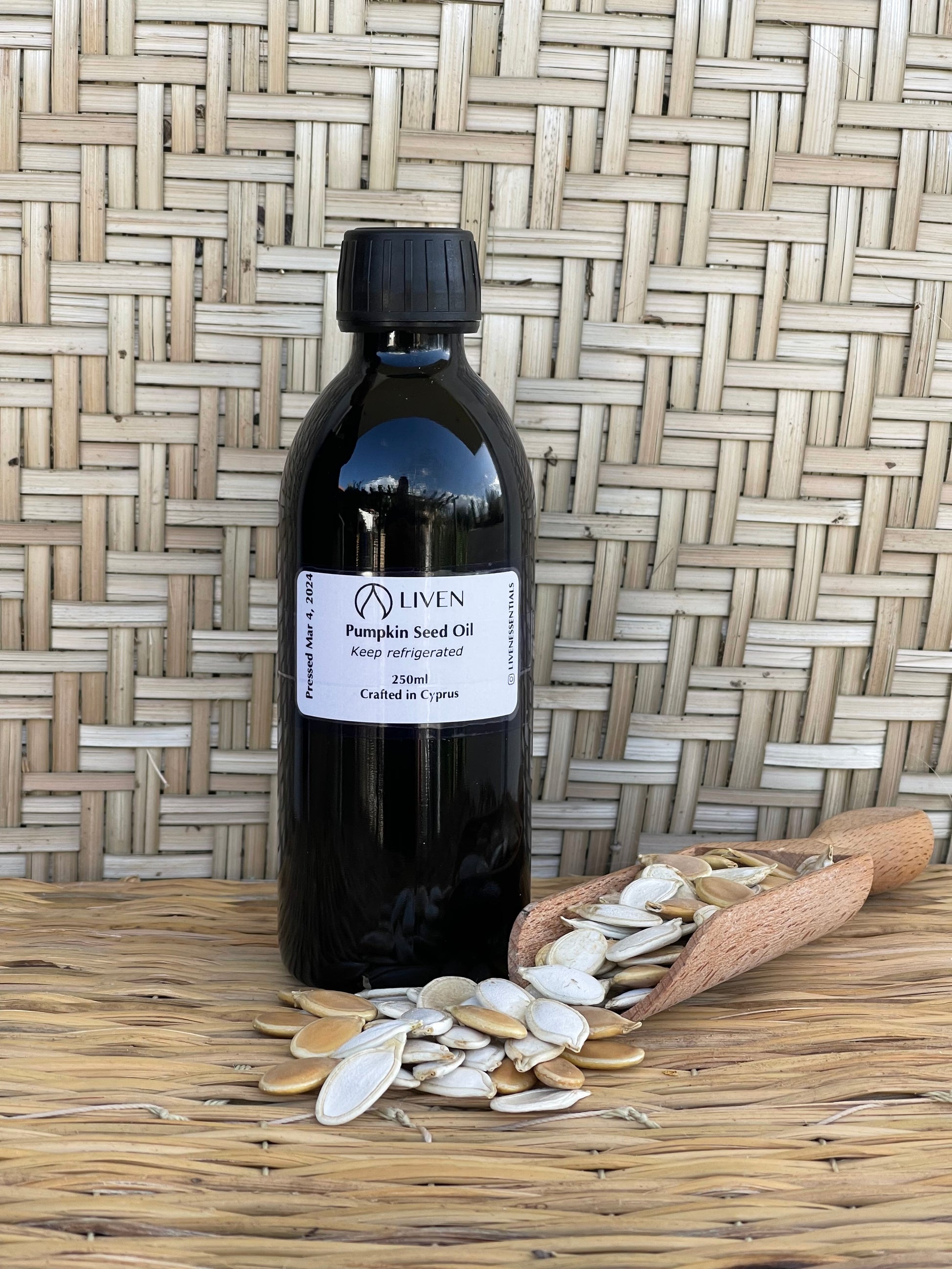 Our Pumpkin Seed Oil has a red vibrant color. The pumpkin seeds were sourced from a local jam producer and cold-pressed in April 2025.